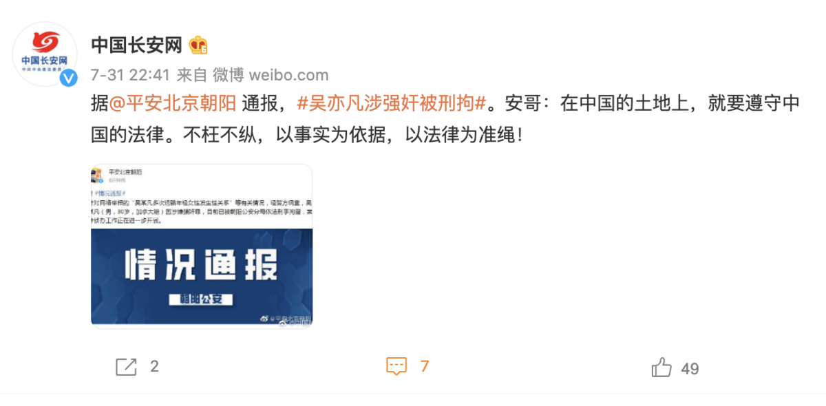 吴亦凡涉强奸罪被刑拘,中央政法委发声:在中国的土地上,就要遵守中国的法律