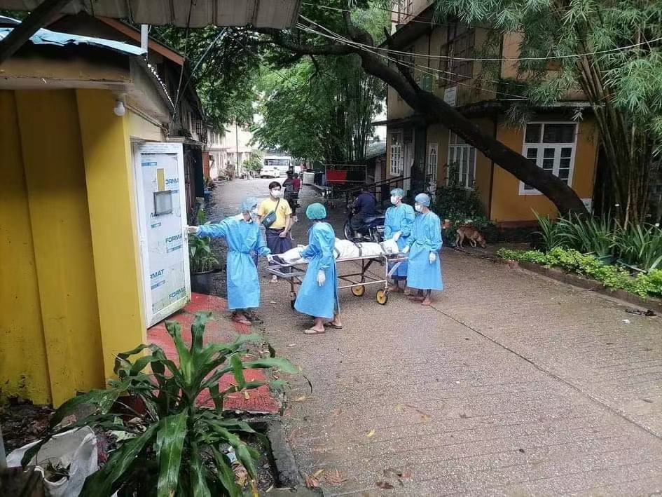 △缅甸医务人员运送新冠肺炎患者