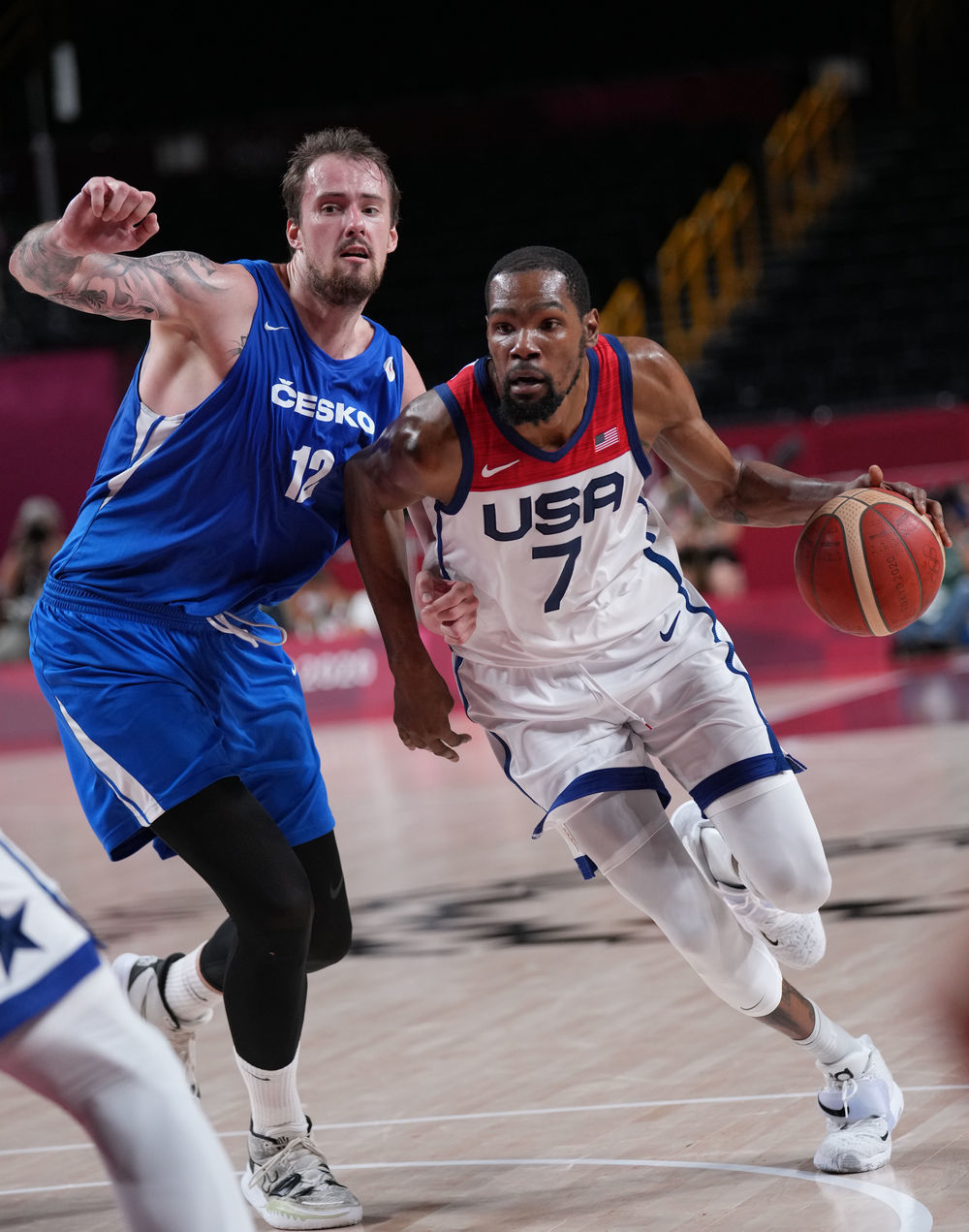 7月31日,美国队球员杜兰特(右)在比赛中突破。 新华社记者孟永民摄