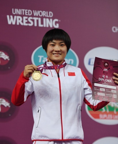 资料图:2019年4月26日,在西安举行的2019年亚洲摔跤锦标赛女子自由式摔跤57公斤级金牌战中,中国选手荣宁宁获得冠军。新华社记者张博文摄