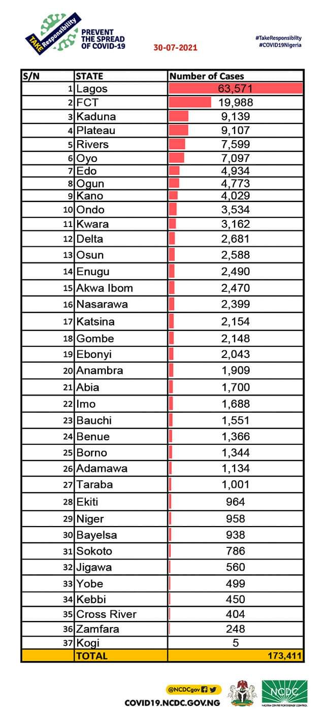 △截至当地时间7月30日,尼日利亚各地新冠肺炎确诊人数统计。(图片来源:尼日利亚疾控中心)