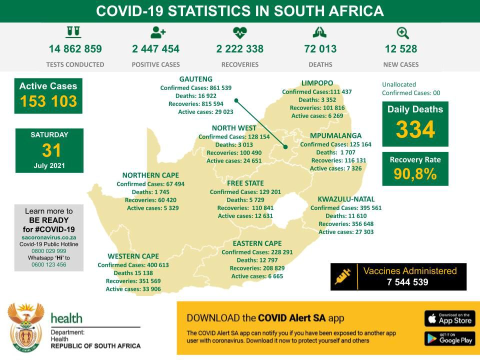 当地时间7月31日,南非卫生部确认南非当天新增新冠肺炎确诊病例12528例,累计确诊2447454例。南非全国已检测14862859人,当日检测56243人。