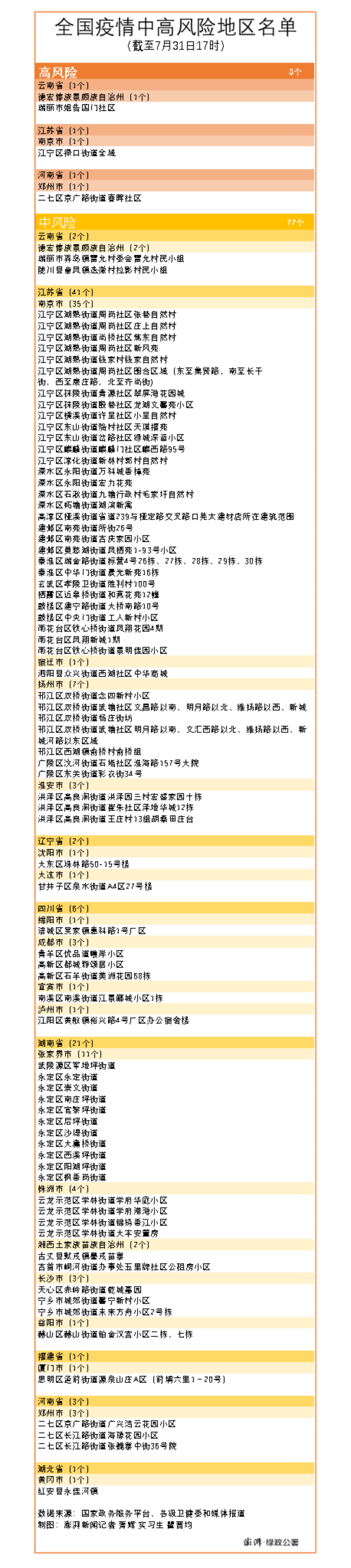 截至7月31日下午7时,江苏扬州5地、湖北省黄冈市红安县1地、四川泸州江阳区1地被调整为中风险地区。自此,全国中高风险地区已升至80个,其中中风险地区77个,高风险地区3个,分别在云南德宏州、江苏南京和河南郑州。