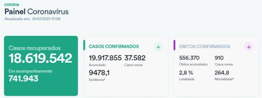 截至当地时间7月31日17时08分,据巴西卫生部发布的数据,该国新增新冠肺炎确诊病例37582例,累计确诊19917855例;新增死亡病例910例,累计死亡556370例;累计治愈18619542例。
