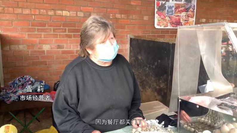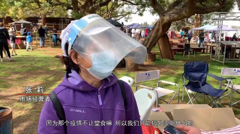 有一个摊位是由中国人经营的,经营者张莉正向顾客售卖饺子和中式熟食。张莉说,她经营着一家饭店,但受疫情影响,顾客很少,所以打算到周末市场来拓展生意。