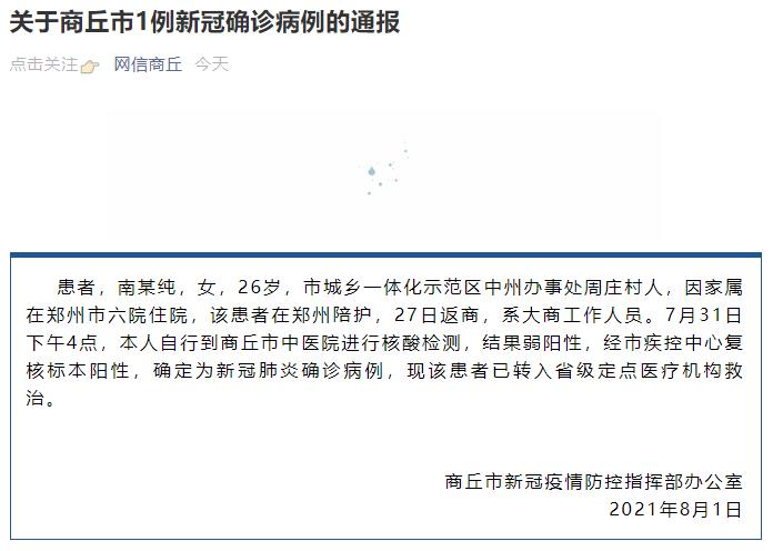据“网信商丘”消息,患者,南某纯,女,26岁,市城乡一体化示范区中州办事处周庄村人,因家属在郑州市六院住院,该患者在郑州陪护,27日返商,系大商工作人员。7月31日下午4点,本人自行到商丘市中医院进行核酸检测,结果弱阳性,经市疾控中心复核标本阳性,确定为新冠肺炎确诊病例,现该患者已转入省级定点医疗机构救治。