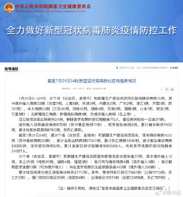 【严防严控,务必当心!#7月31日新增本土病例53例涉八省份#】据国家卫健委官网消息,7月31日0—24时,31个省(自治区、直辖市)和新疆生产建设兵团报告新增确诊病例75例,其中境外输入病例22例(云南7例,上海5例,天津3例,内蒙古2例,广东2例,浙江1例,河南1例,四川1例),本土病例53例(江苏30例,河南12例,湖南4例,云南3例,福建1例,山东1例,湖北1例,宁夏1例);无新增死亡病例;新增疑似病例1例,为境外输入病例(在上海)。继续严防境外输入,#7月31日新增境外输入病例22例#