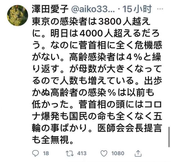 “东京确诊病例已经超过3800人了,明天怕是要突破4000,就这样首相连一点危机感都没有。”