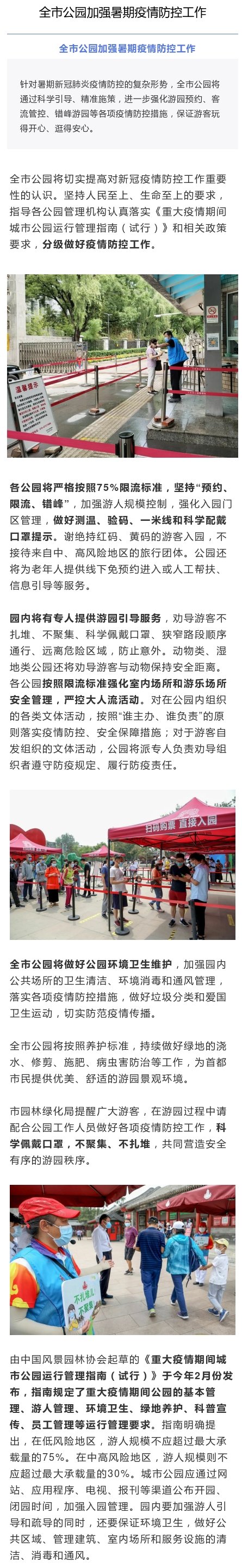 首都园林绿化官博消息,针对暑期新冠肺炎疫情防控的复杂形势,全市公园将通过科学引导、精准施策,进一步强化游园预约、客流管控、错峰游园等各项疫情防控措施,保证游客玩得开心、逛得安心。