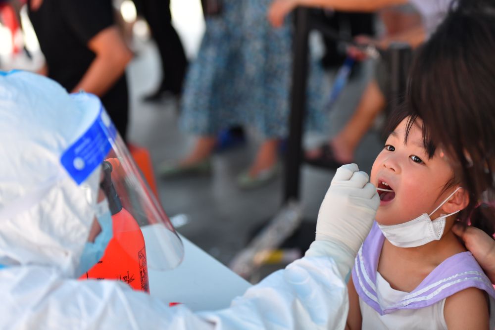 7月31日,在长沙市天心区赤岭路街道白沙花园社区核酸检测点,一名小朋友在接受核酸检测取样。新华社记者 陈泽国 摄