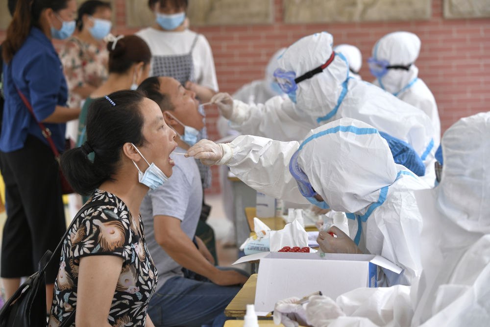 7月29日,在张家界市永定区崇实南校核酸检测点,市民正在有序接受核酸检测取样。新华社发(向韬摄)