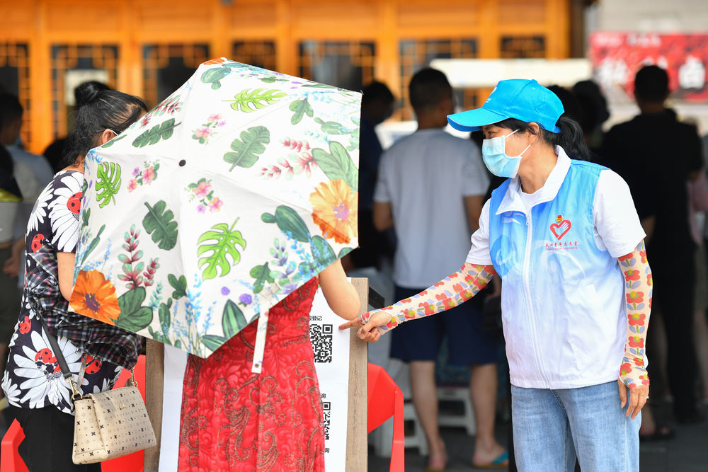 7月31日,在长沙市天心区赤岭路街道白沙花园社区核酸检测点,志愿者引导居民在核酸检测取样前扫码登记身份信息。新华社记者 陈泽国 摄