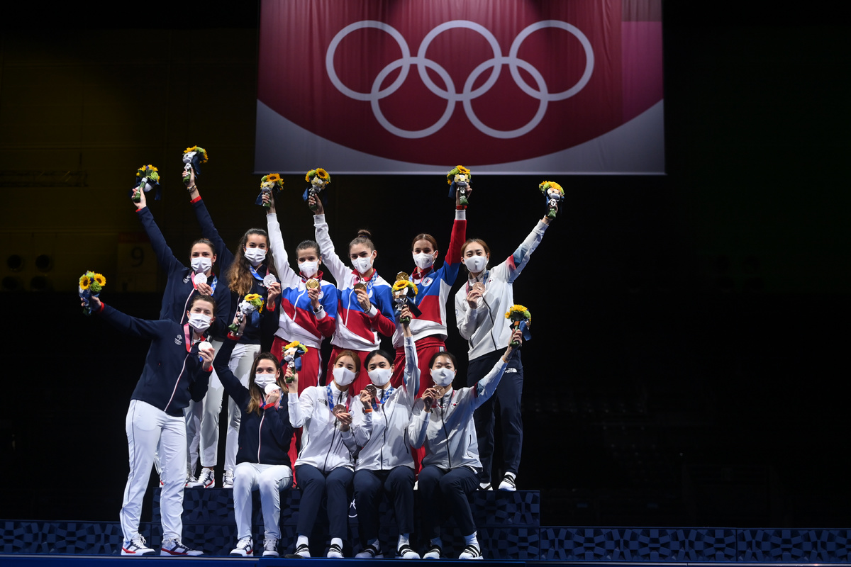 7月31日,获得冠军的俄罗斯运动员、获得亚军的法国选手与获得季军的韩国选手在颁奖仪式上庆祝。当日,在东京奥运会女子团体佩剑决赛中,俄罗斯运动员以45比41战胜法国队,夺得冠军。新华社记者 张宏祥摄