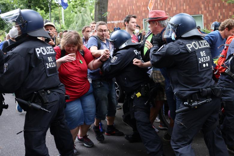 当地时间8月1日,德国“横向思维”组织在柏林非法召集游行,多个街区都有上千人聚集进行示威,反对政府的新冠防疫政策,其间还与警方发生混战。