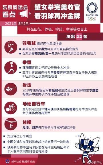 【东京奥运今日看点:看羽球再冲金牌】东京奥运会今天将决出22枚金牌。#中国羽毛球队五个单项全部打进决赛#,在最后两个单项决赛中,男单谌龙VS丹麦名将安赛龙,女双陈清晨/贾一凡VS印尼组合。#汪周雨携手李雯雯女举冲金#,期待为中国举重队送上完美谢幕战。#中国队加油#!