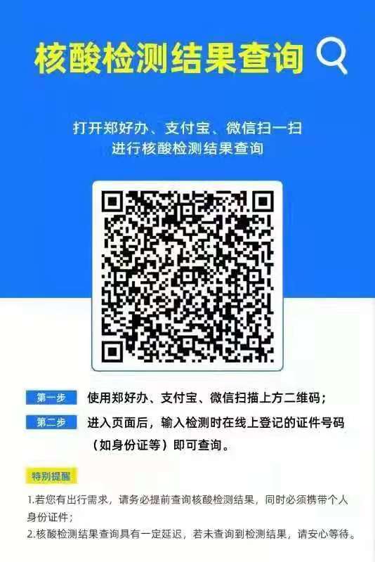 二、非必要不离郑,确需离郑的,需携带纸质核酸检测阴性证明或现场查验电子核酸检测阴性证明(可通过支付宝、微信、郑好办App扫描、识别核酸检测结果查询二维码,或登录郑好办App点击首页“核酸检测结果”进行查询。进入页面后,输入检测时登记的身份证号即可查询核酸检测结果)。