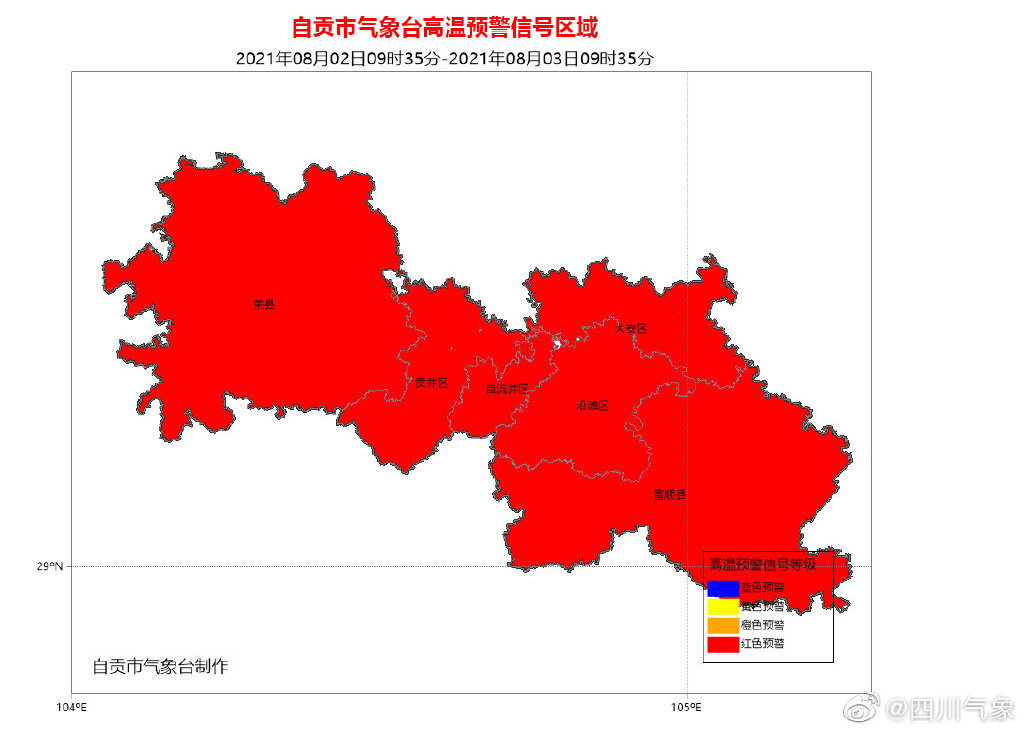 #自贡高温# 自贡市气象台8月2日9时35分对8月2日7时54分第4次确认的第14号高温橙色预警信号,更新为高温红色预警信号:昨日自贡市最高气温已超过39℃,预计自贡市各区县今天白天最高气温将升至40℃。