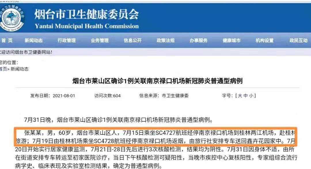 张某某,男,60岁,烟台市莱山区人,7月15日乘坐SC4727航班经停南京禄口机场到桂林两江机场,赴桂林旅游;7月19日由桂林机场乘坐SC4728航班经停南京禄口机场返烟,由旅行社安排专车送回鑫卉花园家中。7月20日开始实行居家健康监测,7月21日—28日先后进行3次核酸检测,结果均为阴性。7月31日因身体不适,由所在街道安排专车转运至初家医院诊疗,当日下午核酸检测可疑阳性,当晚烟台市疾控中心复核阳性,专家组综合流行病学史、临床表现及实验室检测结果,确定为普通型病例。