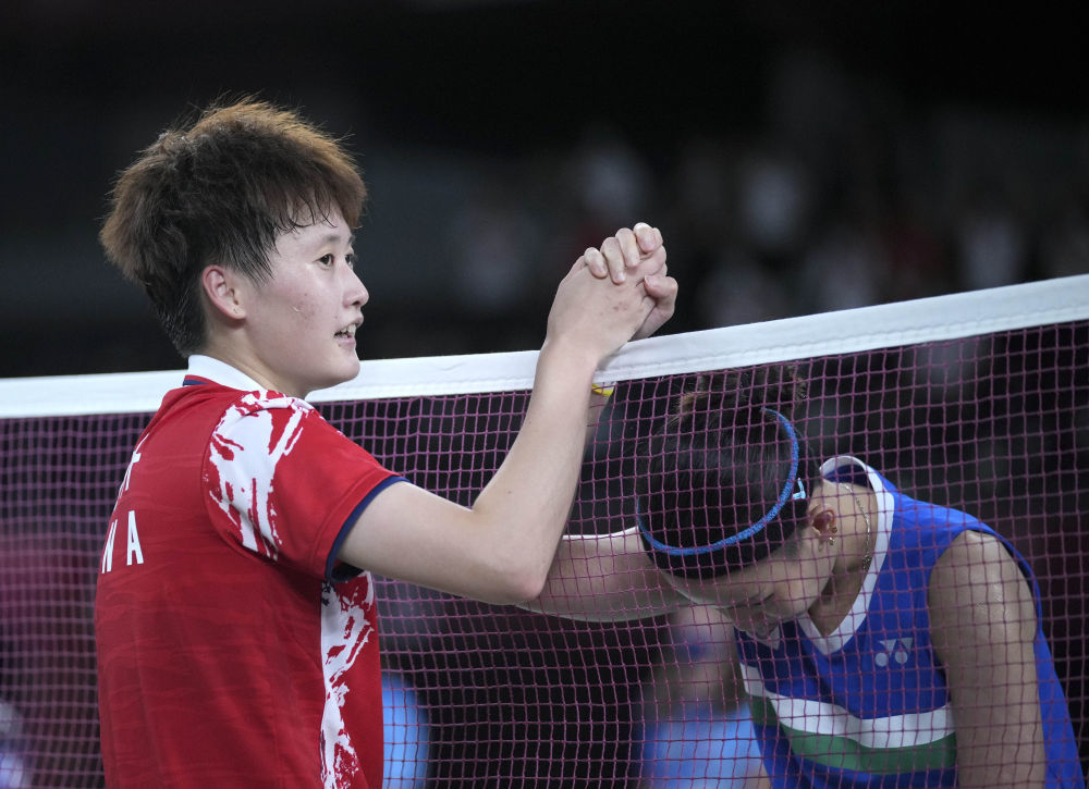 8月1日,陈雨菲在夺冠后与中国台北选手戴资颖互相致意。新华社记者薛玉斌摄