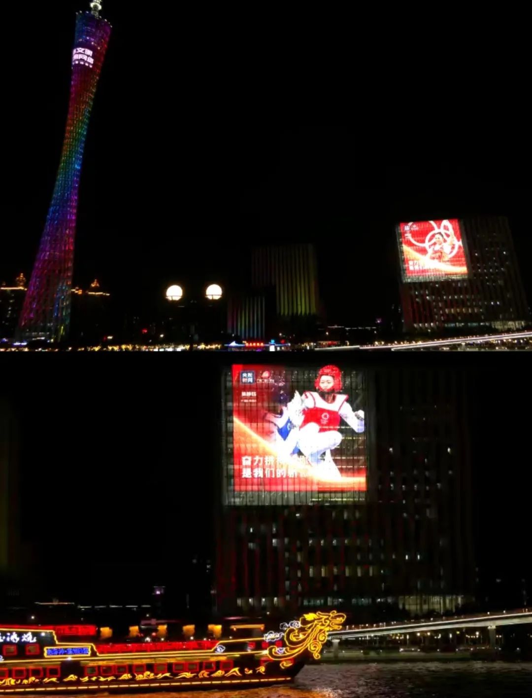 ▲中国奥运健儿海报与广州“小蛮腰”夜景相映成趣。