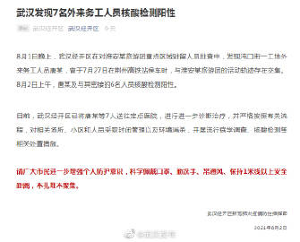 【#武汉发现7名外来务工人员核酸检测阳性#】#情况通报#【武汉发现7名外来务工人员核酸检测阳性】8月1日晚上,武汉经开区在对淮安某旅游团重点区域驻留人员排查中,发现沌口街一工地外来务工人员唐某,曾于7月27日在荆州高铁站候车时,与淮安某旅游团的活动轨迹存在交集。8月2日上午,唐某及与其密接的6名人员核酸检测阳性。
