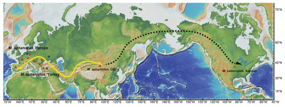 剑齿虎属自欧亚向北美的迁移示意图。(中科院古脊椎所供图)