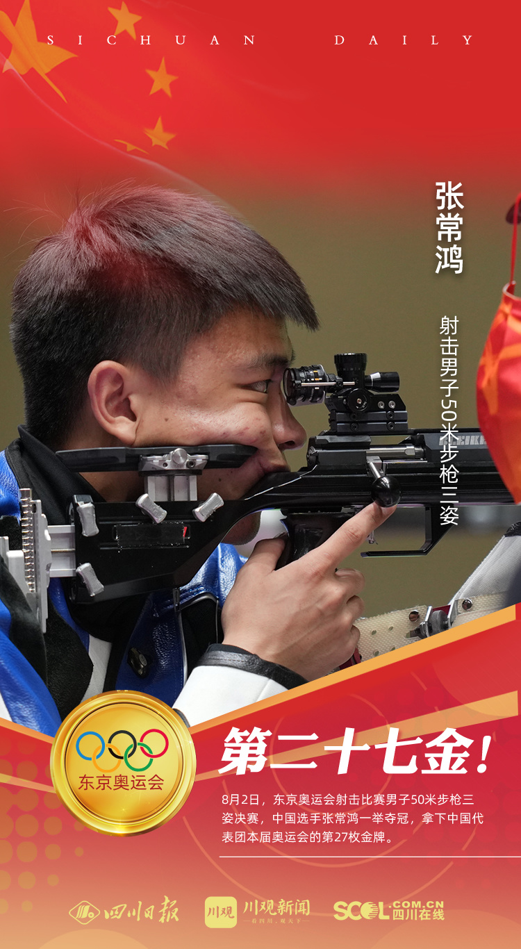 从第一组5发跪姿射击开始,张常鸿就排名第一。在难度最大的立姿射击中,张常鸿虽然曾略有起伏,打出一枪8.5环,但他很快调整状态,在40发子弹打完后仍然领先。最后5发子弹,张常鸿和俄罗斯奥委会队选手卡门斯基展开了激烈的角逐,在倒数第三发,越战越勇的张常鸿打出10.9的完美成绩,彻底奠定胜局。最终,这名“00后”小将以466环、打破世界纪录的成绩为中国体育代表团拿下本届奥运会上的第27枚金牌,同时也让中国射击队在东京的成绩定格为4金、1银、6铜。