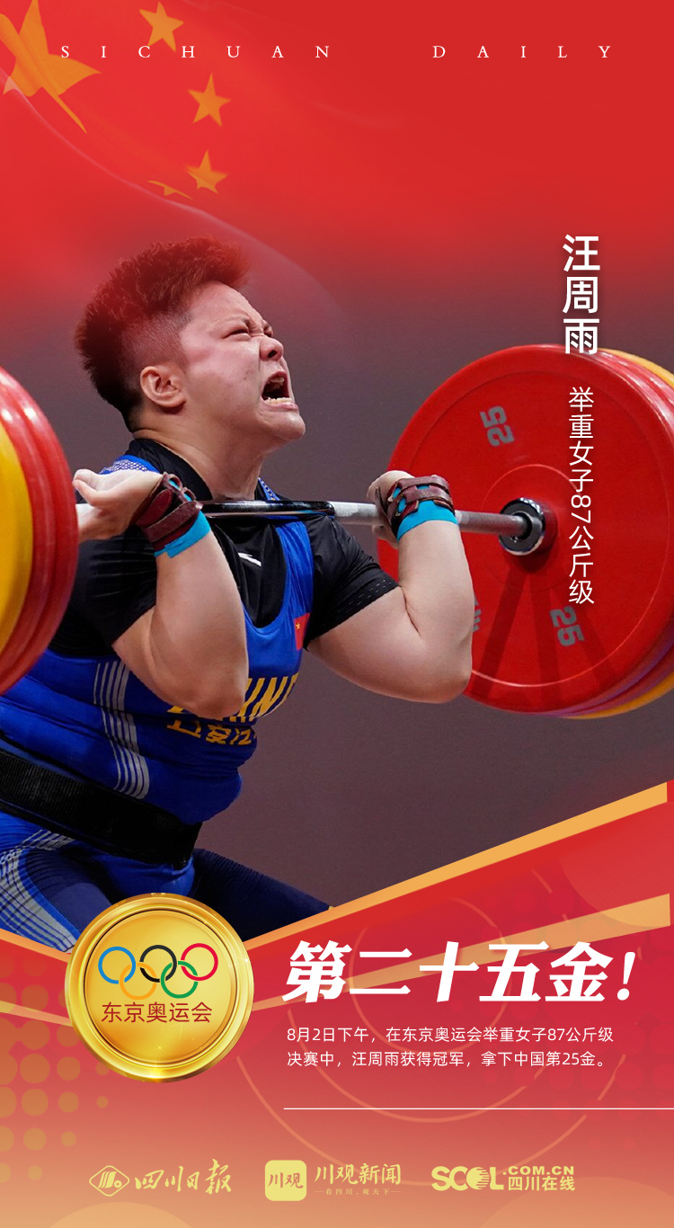 8月2日,在东京奥运会举重女子87公斤级A组比赛中,中国姑娘汪周雨在抓举开把115公斤失败的不利情况下,顶住压力,以抓举120公斤、挺举150公斤,总成绩270公斤的表现夺得金牌,这是中国奥运代表团在东京奥运会上获得的第25枚金牌。