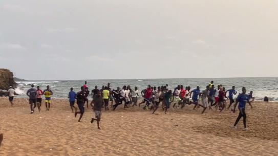 海滩上部分塞内加尔民众在进行有计划的训练。很多在沙滩上锻炼的人都来自当地的体育俱乐部,比如说有摔跤俱乐部,足球俱乐部,他们每天傍晚都在这片沙滩上实施自己的锻炼计划。