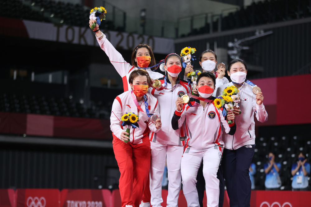 8月2日,冠军印度尼西亚组合波莉/拉哈尤、亚军中国组合陈清晨/贾一凡、季军韩国组合金昭映/孔熙容在颁奖仪式上。新华社记者欧东衢摄