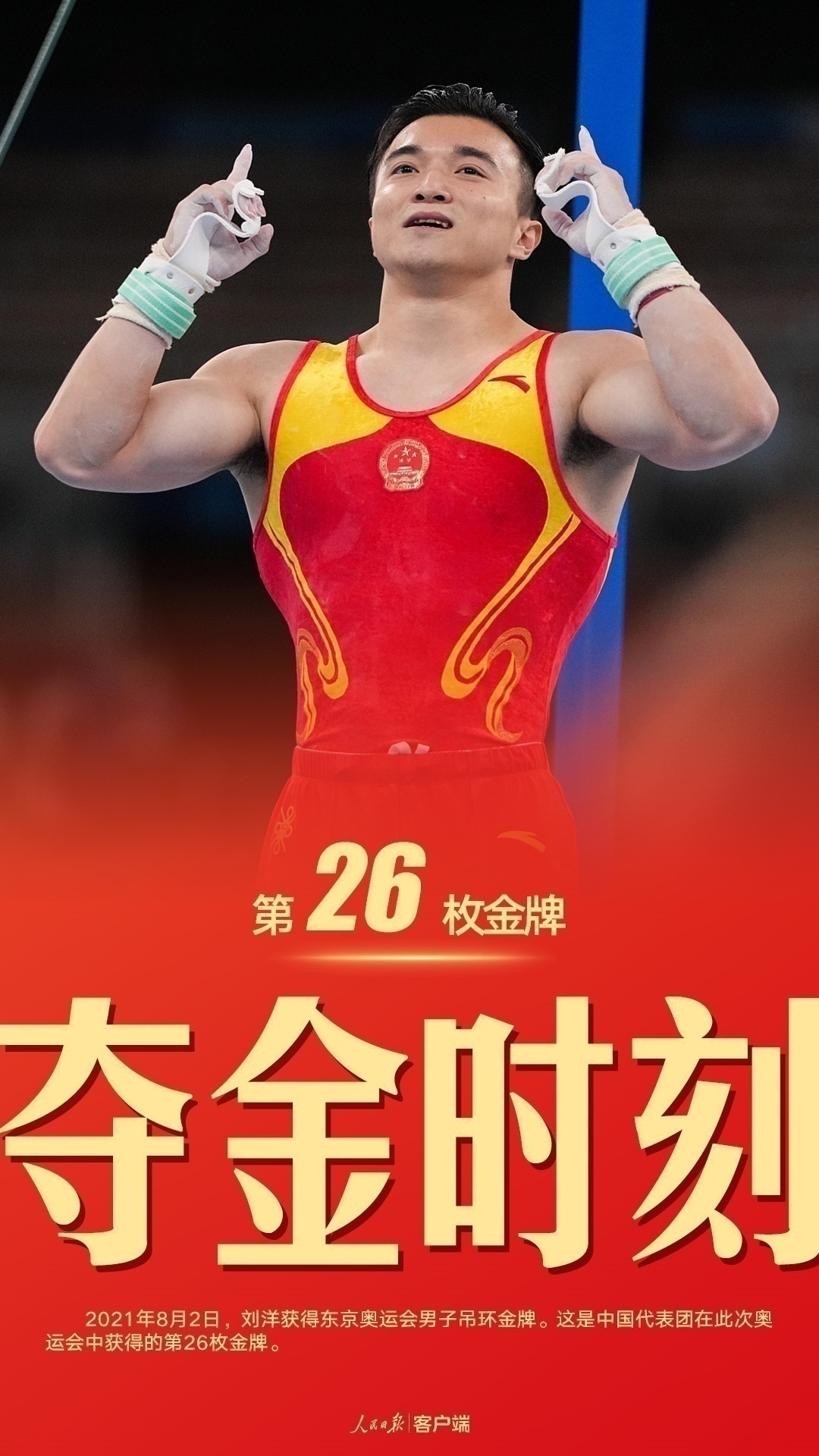 刘洋获得东京奥运会竞技体操男子吊环金牌,另一名中国选手尤浩获得银牌。这是中国代表团在此次奥运会中获得的第26枚金牌。