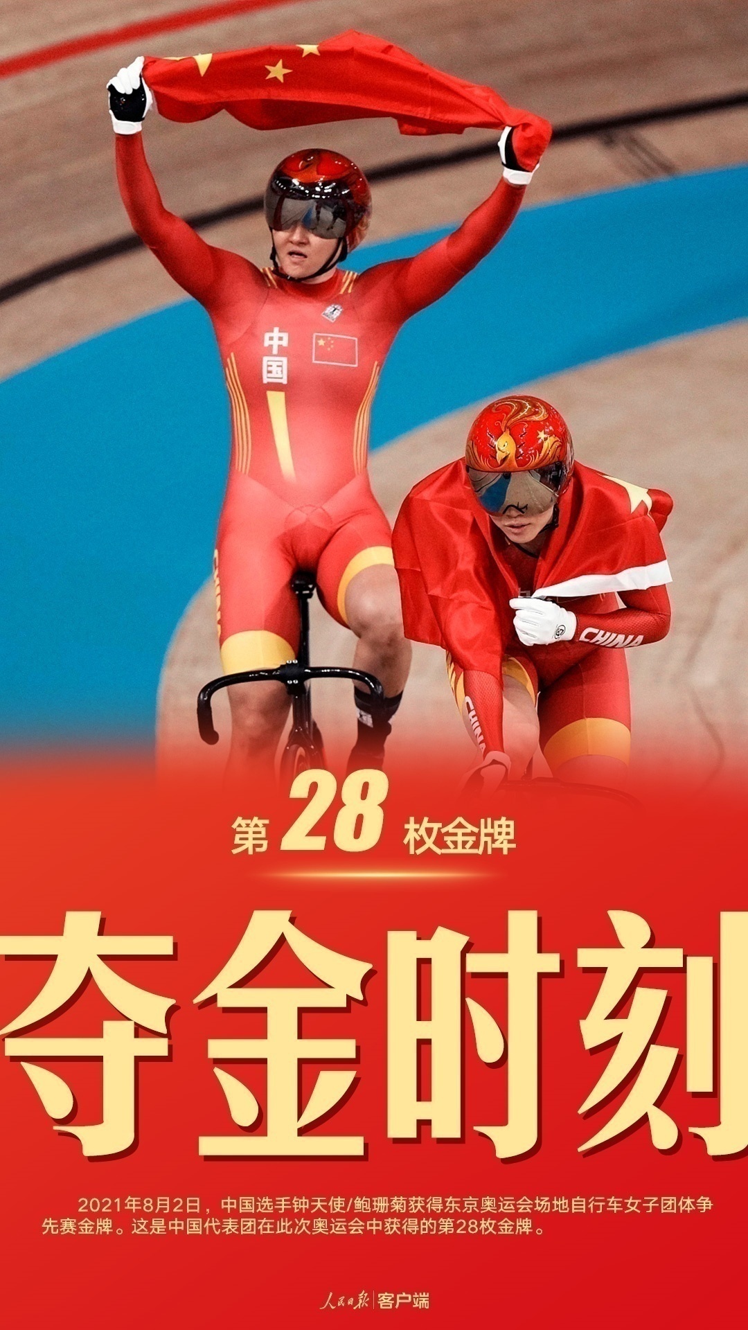 中国选手钟天使/鲍珊菊击败德国组合,获得东京奥运会场地自行车女子团体争先赛金牌。这是中国代表团在此次奥运会中获得的第28枚金牌。
