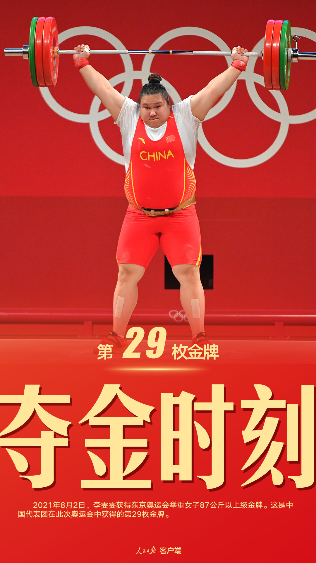 李雯雯以绝对优势获得东京奥运会举重女子87公斤以上级金牌。这是中国代表团在此次奥运会中获得的第29枚金牌。