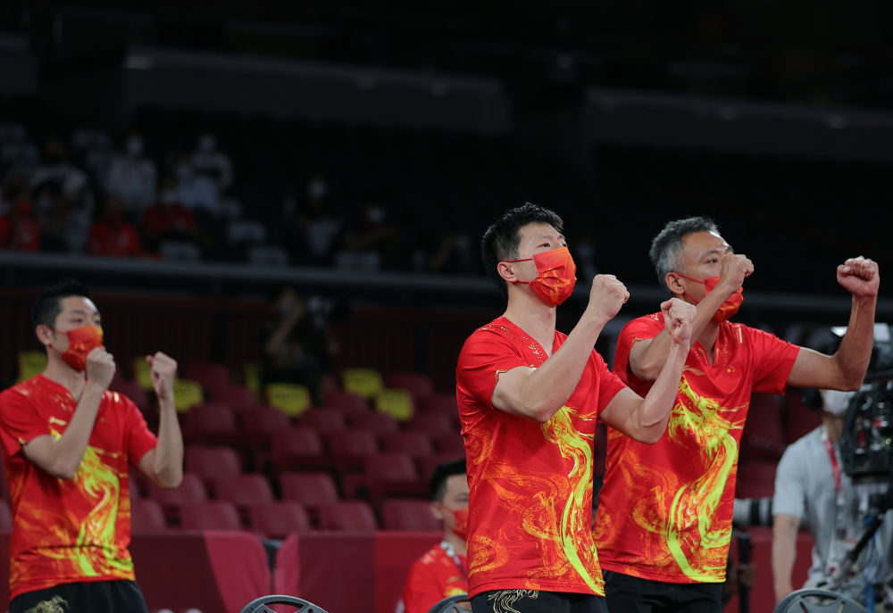 8月2日,中国队成员为樊振东加油。新华社记者 王东震 摄