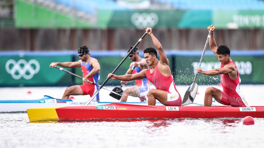 8月2日,中国选手刘浩(左)、郑鹏飞在男子1000米双人划艇四分之一决赛中。新华社记者 潘昱龙 摄