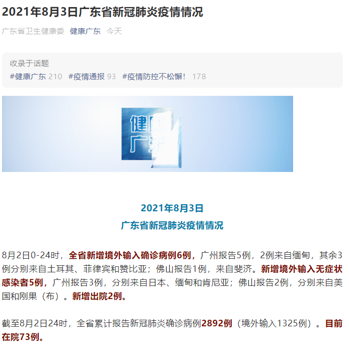 截至8月2日24时,广东省累计报告新冠肺炎确诊病例2892例(境外输入1325例)。目前在院73例。