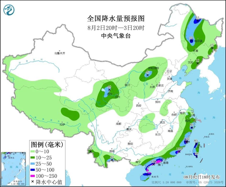 2日20时至3日20时,江南东部、华南南部、东北地区西部、青海东部、内蒙古中部偏南地区、陕西北部、海南岛、台湾岛等地的部分地区有中到大雨。