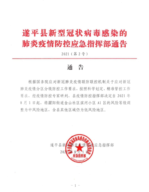 根据国务院应对新冠肺炎疫情联防联控机制关于应对新冠肺炎疫情分区分级防控工作要求,按照科学划定、精准管控工作要求,经疫情防控专家研判,县疫情防控指挥部决定自2021年8月1日起,将灈阳街道金山社区滨河小区A1区的风险等级调整为中风险地区,全县其他区域仍为低风险地区。