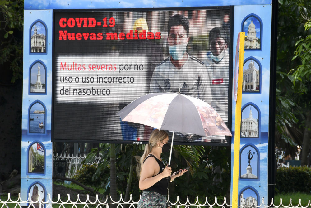 6月29日,在古巴首都哈瓦那,一名女子戴着口罩走过一块写有防疫提醒信息的广告屏。新华社发(华金·埃尔南德斯摄)