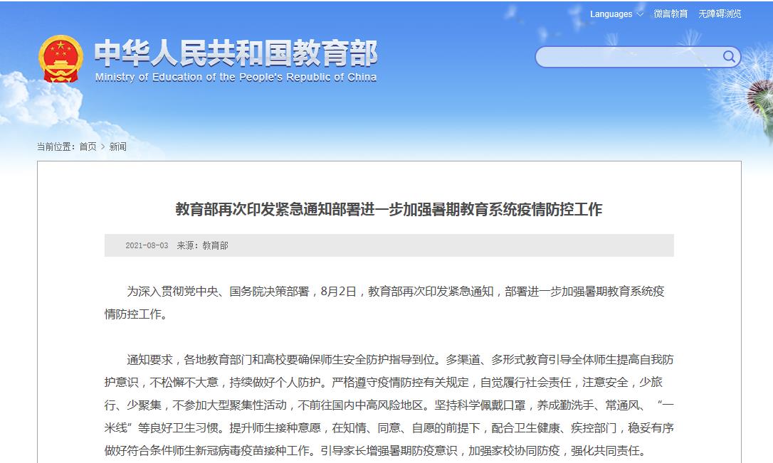 央视网消息:为深入贯彻党中央、国务院决策部署,8月2日,教育部再次印发紧急通知,部署进一步加强暑期教育系统疫情防控工作。