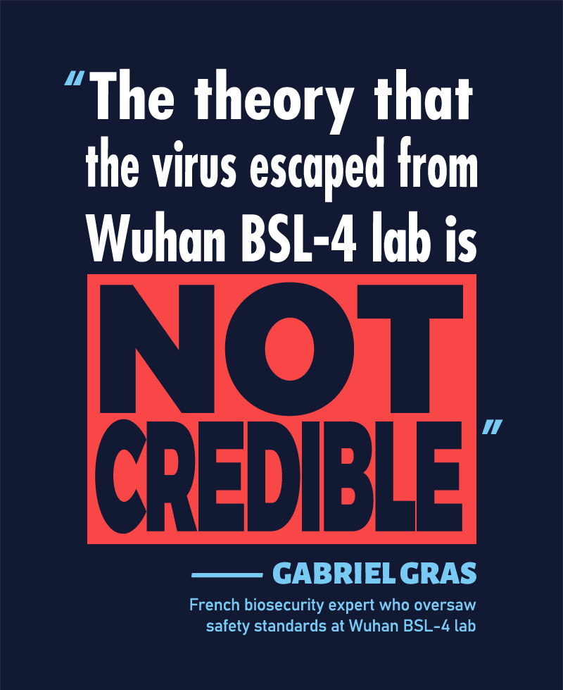 “武汉P4实验室是在法中密切合作下建造的,我对其安全性毫不怀疑。武汉实验室病毒泄漏说不可信。”格拉斯曾受聘为法国驻华大使馆技术专家,参与协调执行2004年中法关于新发传染病的合作协议。2012年至2017年间,他每个月都去武汉的病毒实验室一到两次。