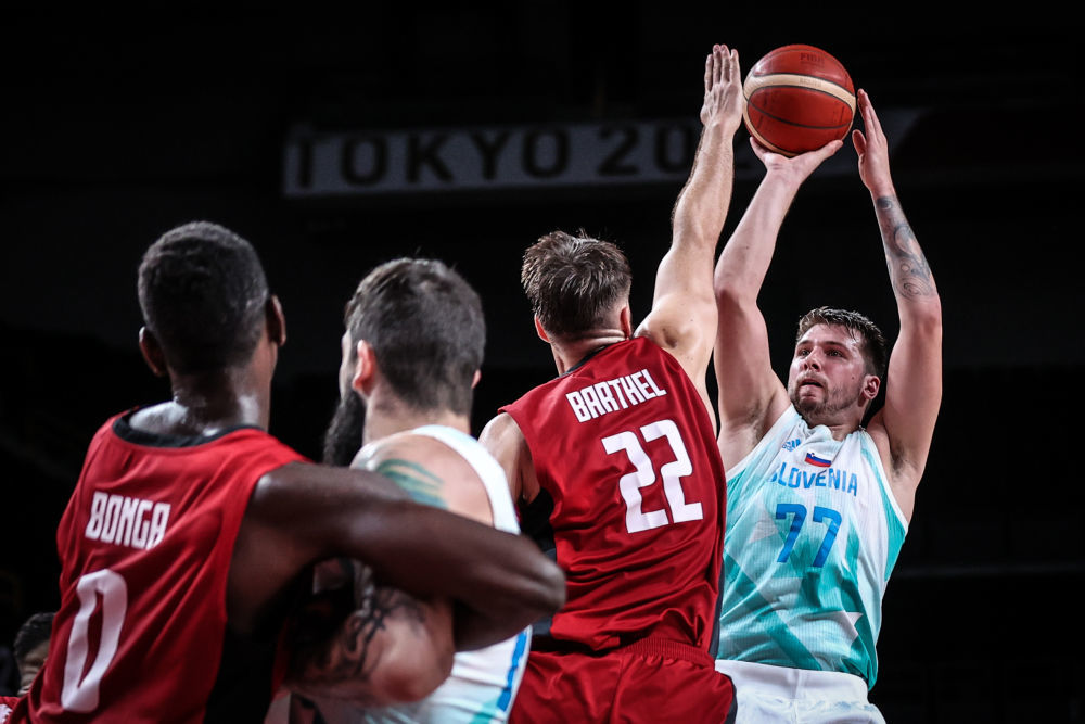 8月3日,斯洛文尼亚队球员东契奇(右一)在比赛中投篮。新华社记者 潘昱龙 摄