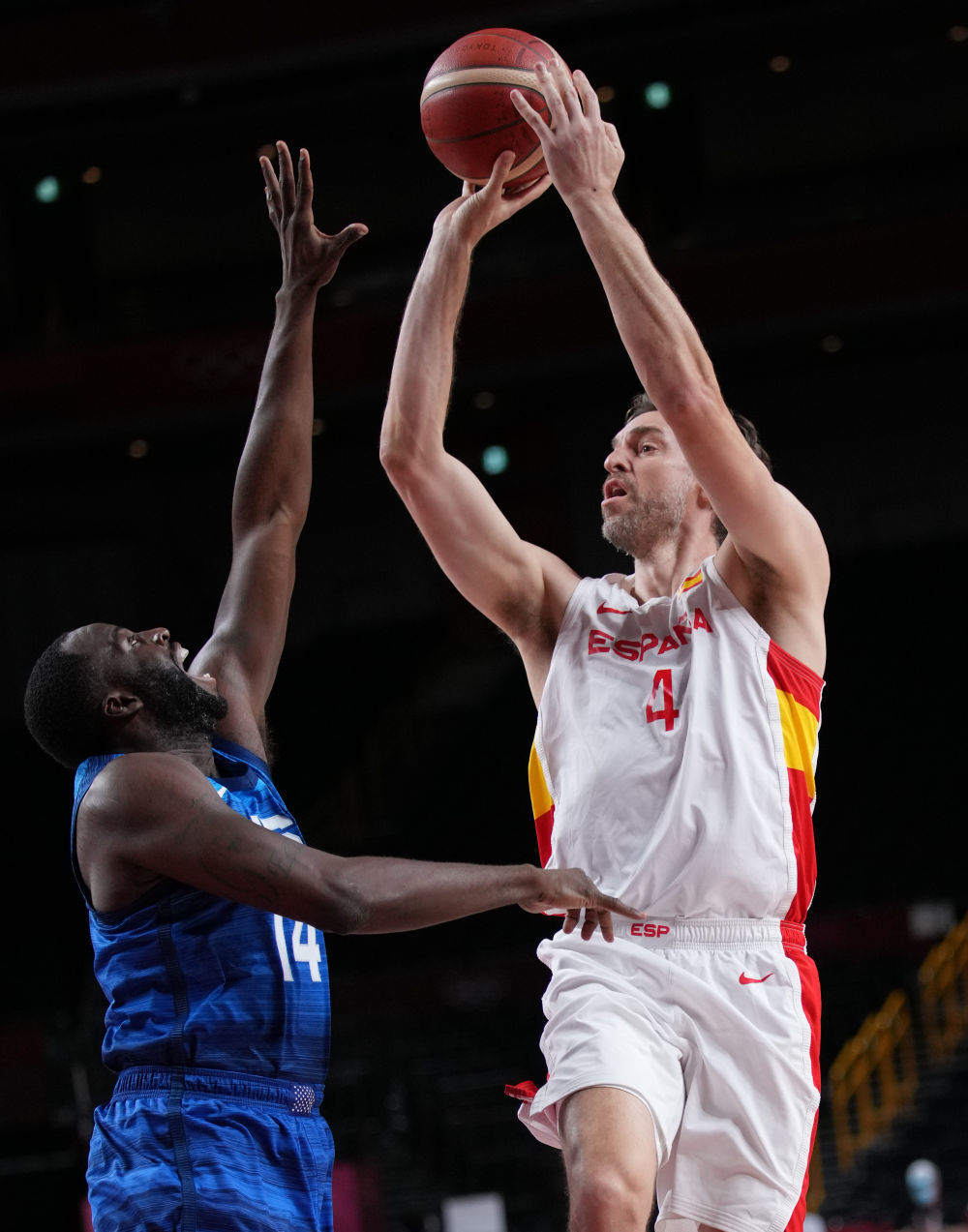 8月3日,西班牙队球员大加索尔(右)在比赛中投篮。新华社记者 孟永民 摄