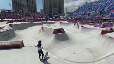 滑板女子个人碗池赛的角逐已经开始!与街式赛不同,碗池赛在一个充满各种曲线、弧面的碗池形场地中进行。