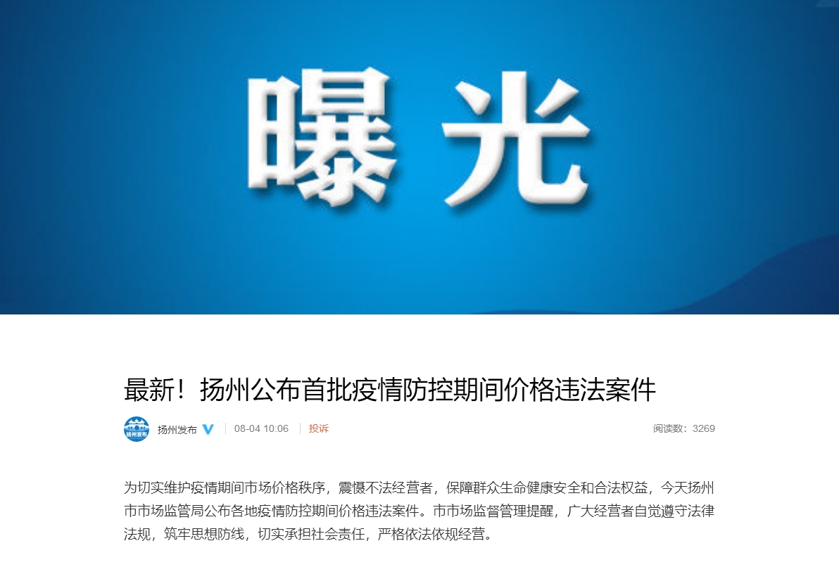 为切实维护疫情期间市场价格秩序,保障群众生命健康安全和合法权益,今天(8月4日)江苏省扬州市市场监管局公布各地疫情防控期间价格违法案件。扬州市市场监督管理提醒,广大经营者自觉遵守法律法规,筑牢思想防线,切实承担社会责任,严格依法依规经营。