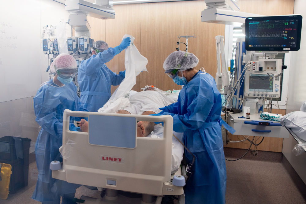 4月8日,在西班牙巴塞罗那医院,医务人员为新冠患者进行治疗。(新华社发,弗朗西斯科·阿维亚摄)
