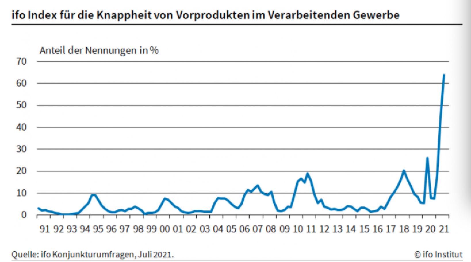 根据德国以弗经济研究所8月2日公布的调查结果,零部件以及初级产品的短缺正在成为德国工业面临的难题。调查结果表明,约三分之二的德国工业企业受到了材料短缺的影响,并可能拖累德国经济增长。