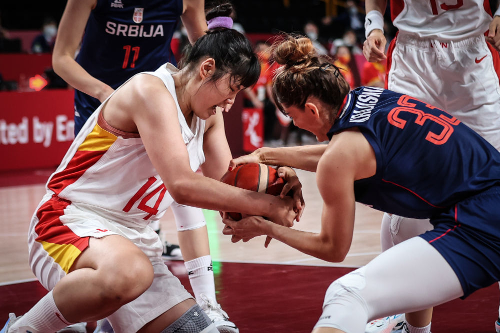 8月4日,中国队球员李月汝(左)在比赛中与塞尔维亚队球员克拉伊什尼克拼抢。当日,在东京奥运会女子篮球四分之一决赛中,中国队以70比77不敌塞尔维亚队,无缘半决赛。新华社记者 潘昱龙 摄