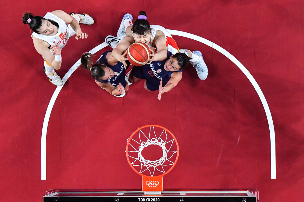 8月4日,中国队球员李月汝(上右)在比赛中拼抢篮板球。新华社记者 潘昱龙 摄