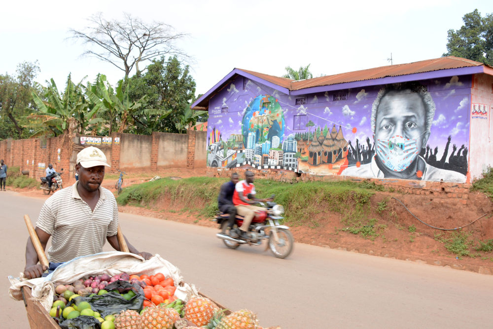 2020年8月7日,乌干达坎帕拉,一名水果摊贩经过防疫宣传画。(新华社发,尼古拉斯·卡乔巴摄)